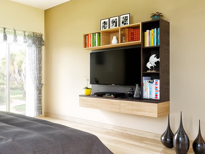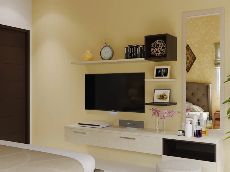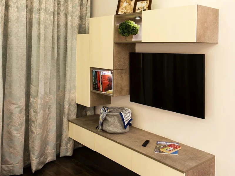 Your living room is the perfect place to showcase your collectables, books and trophies and more! This spacious contemporary entertainment unit in a delightful combo of glossy plum and ash wood comes with ample open and closed storage. Bright pops of colour, alongside neutral tones, add a hearty dose of cheer to the design narrative. The false ceiling for the living room features rustic wooden beams that exude cosy warmth and plenty of styles.